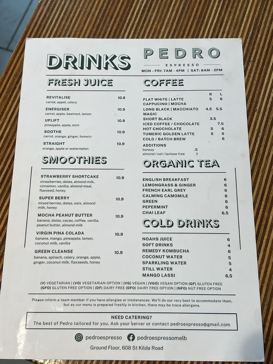 Nestled on St Kilda Rd in Melbourne, Pedro Espresso is a culinary gem that delights diners with a diverse menu. Here, every meal is crafted to satisfy, from hearty sandwiches to invigorating all-day breakfast options.